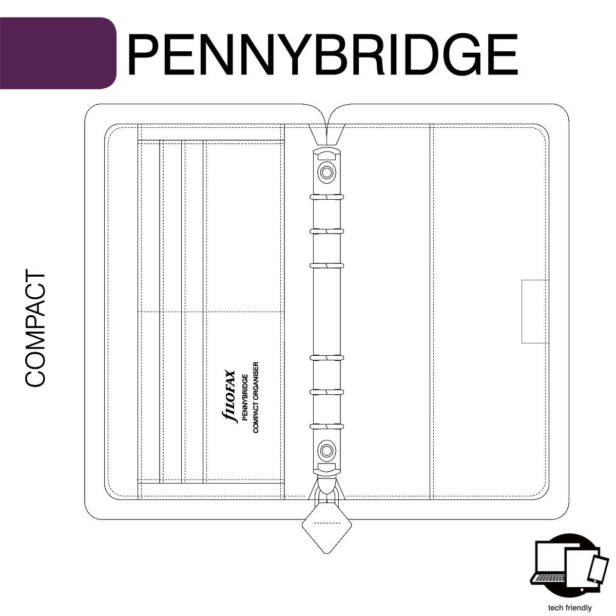 Klasszikus Filofax gyűrűs kalendárium design modern köntösben. A Pennybridge Compact Filofax gyűrűs kalendárium nemcsak egy organiser, hanem tárca és mobiltelefon-tartó is egyben, így tökéletesen ötvözi a technikát a papír alapú időgazdálkodással. A divatos színekben kapható, bőrhatású borító és a zipzáras záródás teszi nélkülözhetetlen kellékké ezt a Filofax gyűrűs kalendáriumot.