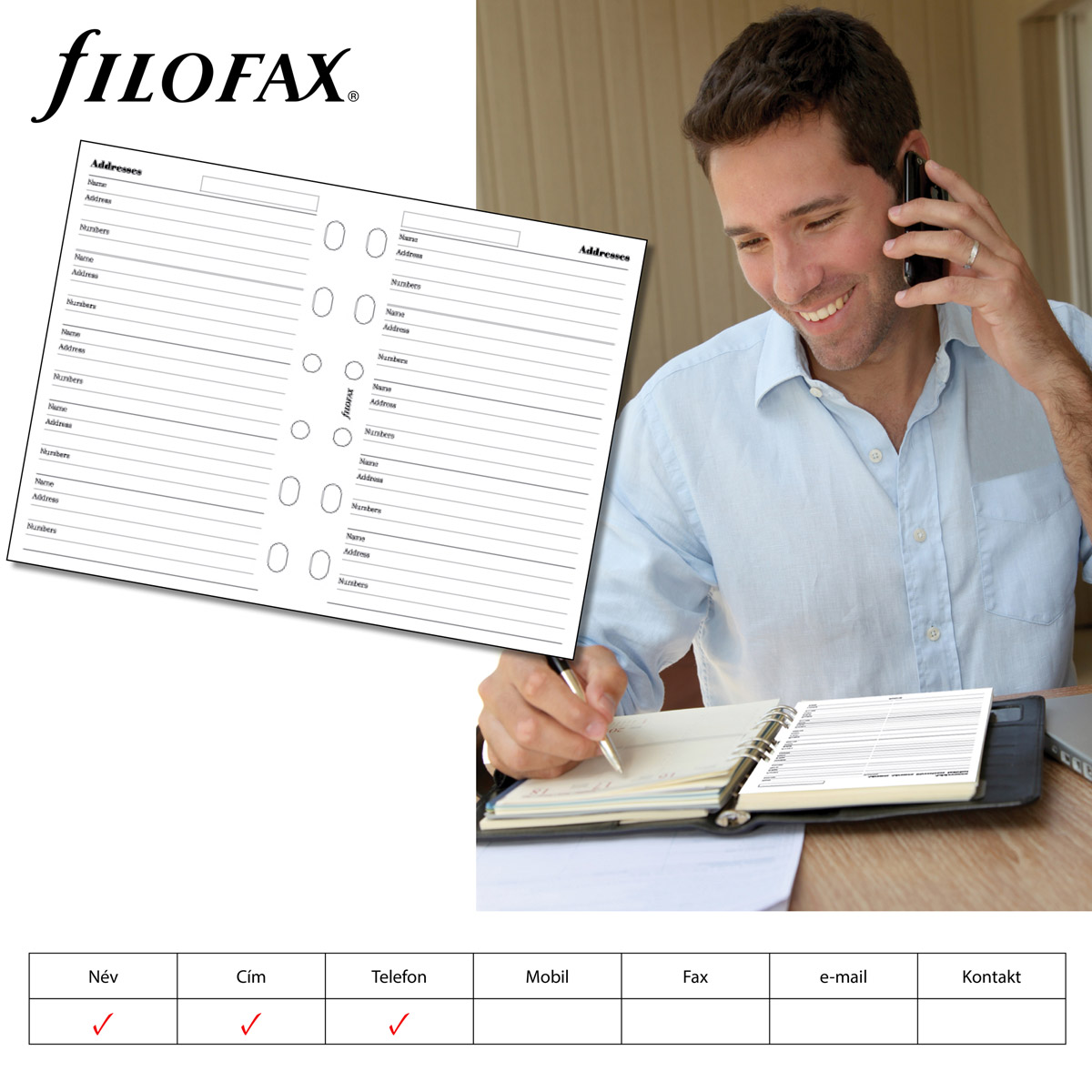 Az évek során összegyűjtött kapcsolatok a legnagyobb értéket képviselik Önnek. Ne hagyja elveszni ezt az értéket egy “apró” műszaki hiba miatt! Használja ki a Filofax széles pótlapválasztékát ezen a téren is! Kontakt lista (nevek, telefonszámok, címek, e-mail címek) számos változatban, minden mérethez.