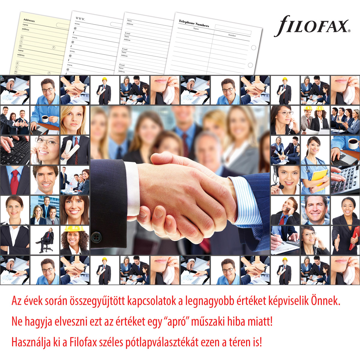 Az évek során összegyűjtött kapcsolatok a legnagyobb értéket képviselik Önnek. Ne hagyja elveszni ezt az értéket egy “apró” műszaki hiba miatt! Használja ki a Filofax széles pótlapválasztékát ezen a téren is! Kontakt lista (nevek, telefonszámok, címek, e-mail címek) számos változatban, minden mérethez. Méret: Mini.