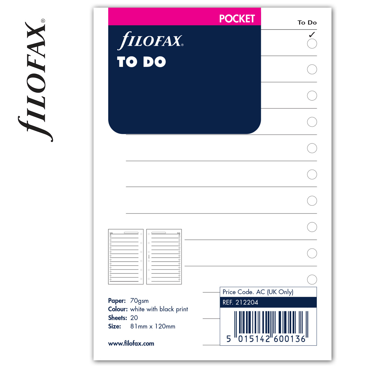 Az egyik legfontosabb, legtöbbet használt pótlap a Tennivalók lista, feladatok és tennivalók rögzítésére, nyomonkövetésére. Pocket, Pocket Slim és Pocket ZIP méretű Filofaxokban használható. Méret: Pocket (S, 3) - 81 × 120 mm.