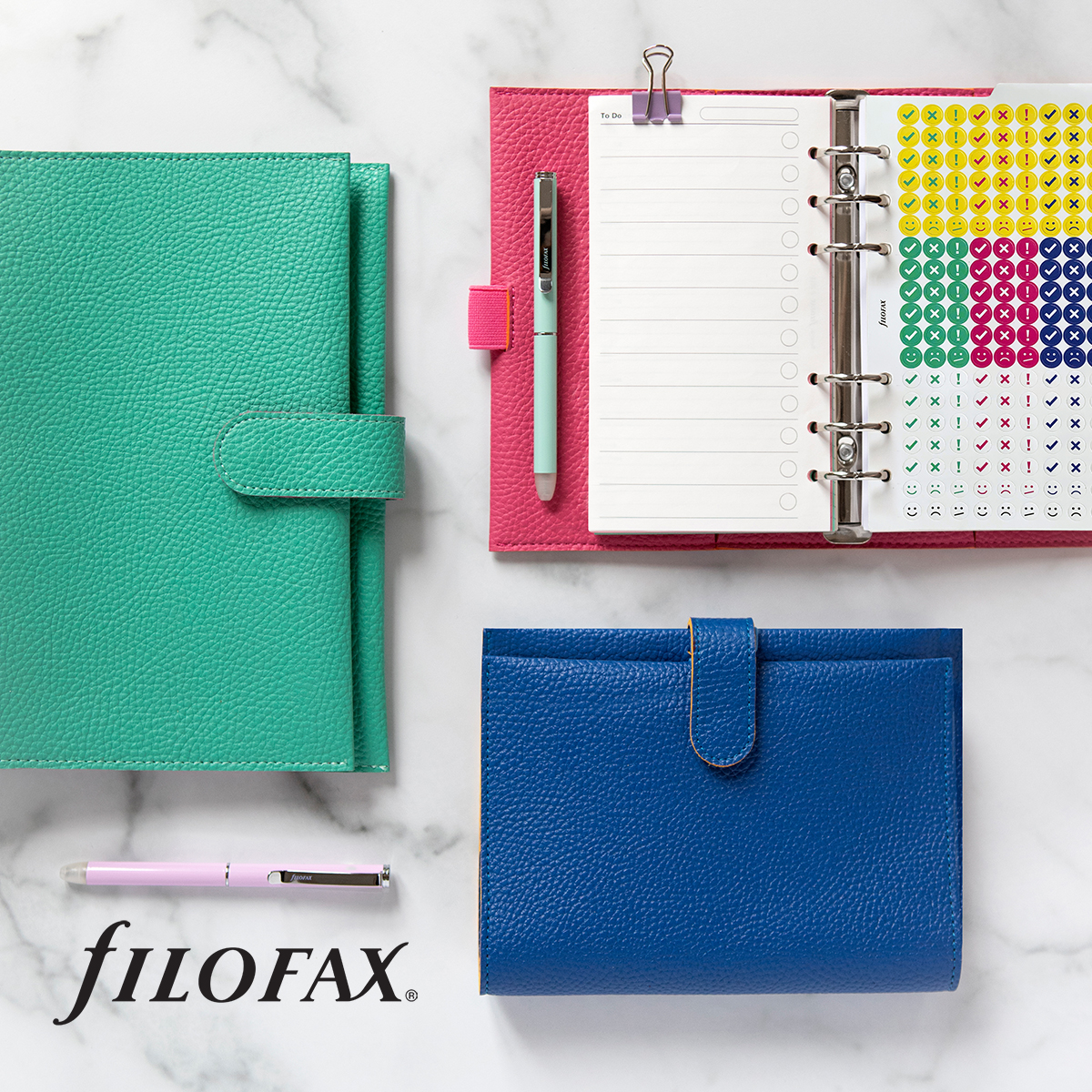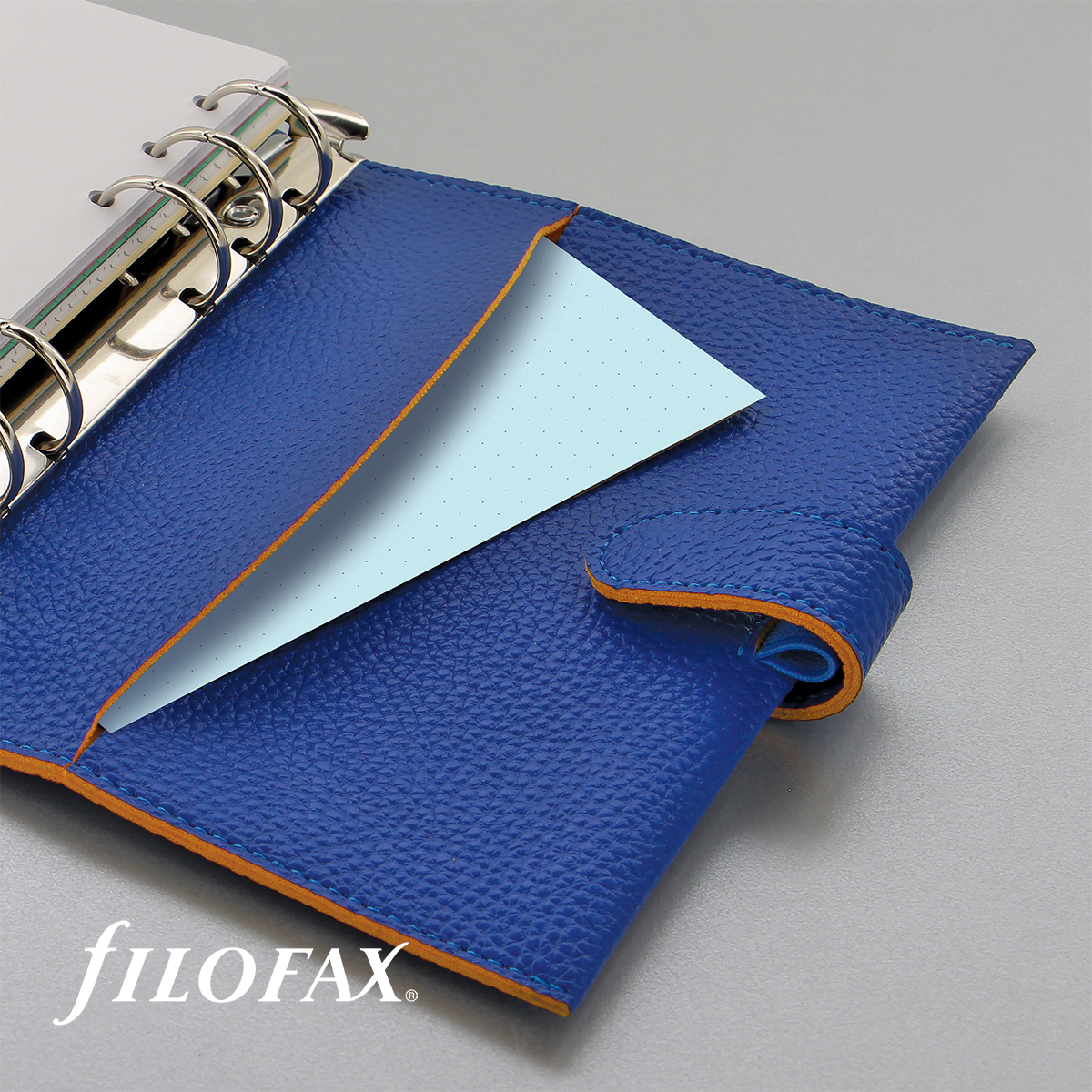A Pop A5 Filofax élénk színű borítója vastag, textúrált, bőrhatású műbőrből készül. A flexibilis borító, a kontrasztos belső zsebek, valamint a termékben található színes lapok, a stencil lap és a matricák teszik egyedivé és fiatalossá ezt a terméket.