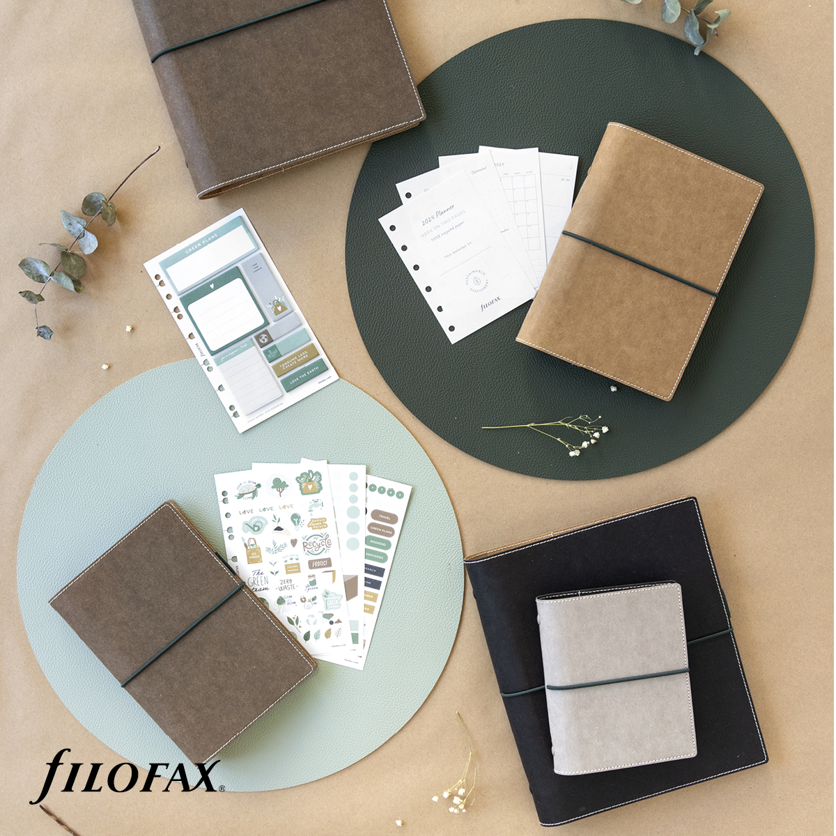 Az Eco Essential Filofaxok vegan, cellulózszálas anyagból, míg a belső lapok újrahasznosított papírból készülnek. A magyar nyelvű naptárbetét FSC papírból készül. Újrahasznosított papírból készült naptárbetétet is rendelhet a kapcsolódó termékek közül. Az Eco Essential termékcsalád matricákat és öntapadó jegyzeteket is tartalmaz, melyeket szintén megtekinthet a kapcsolódó termékek között.