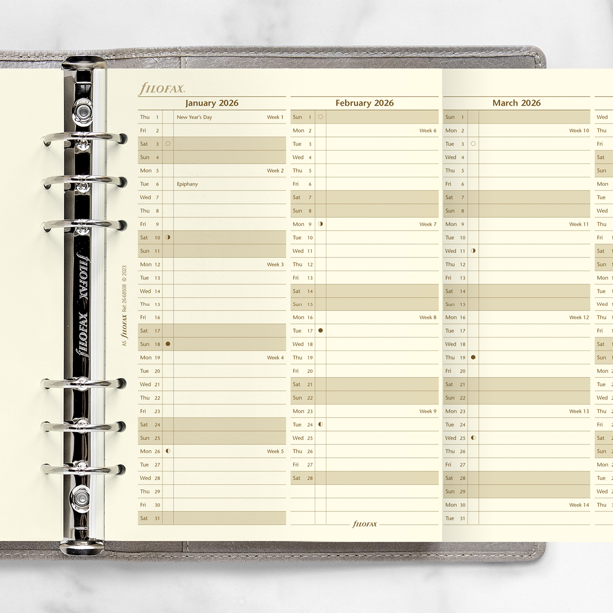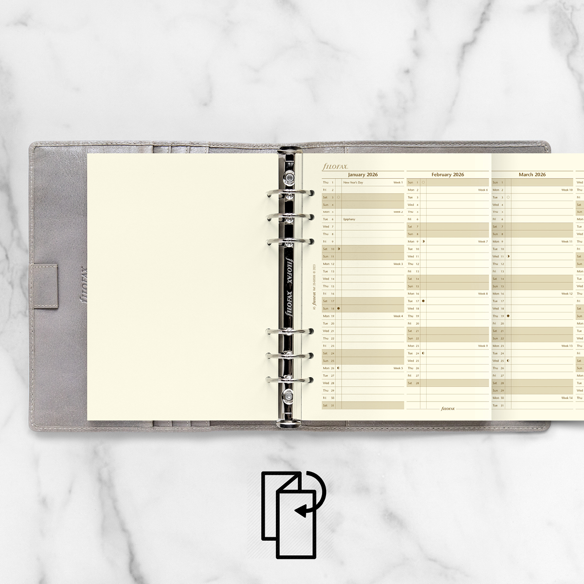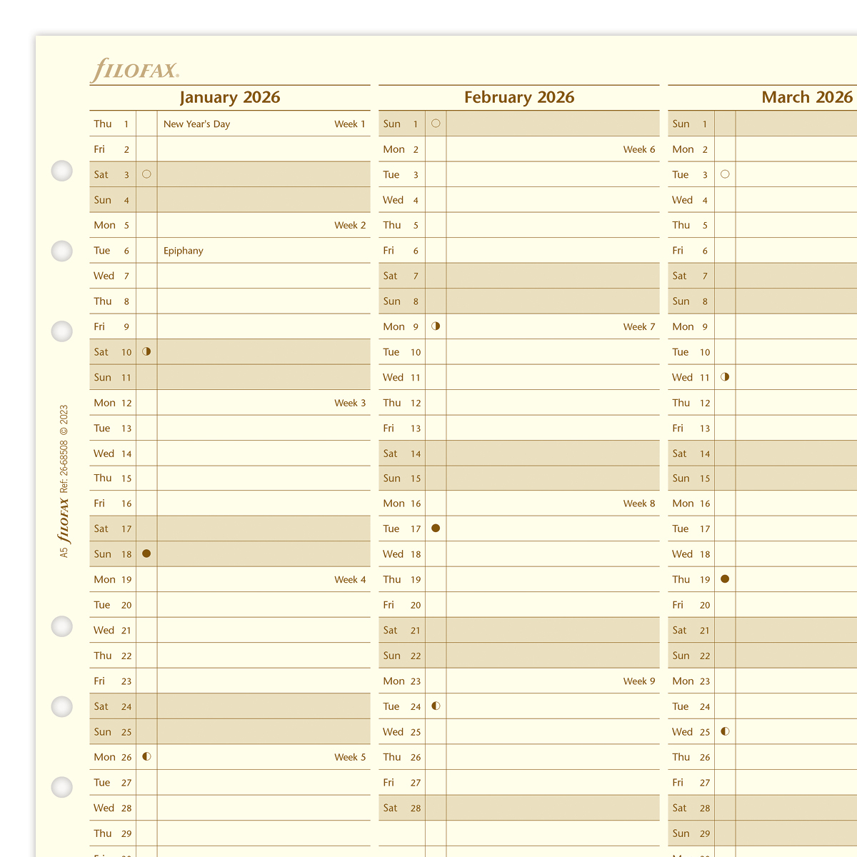 Filofax éves tervező naptárbetétek, vertikális elrendezéssel, kihajtható lapon. 80 g krém színű papír. Filofaxokban, Clipbook jegyzetekben és más márkájú gyűrűs kalendáriumokban is használható. Méret: A5 (L, 1) - 148 × 210 mm
