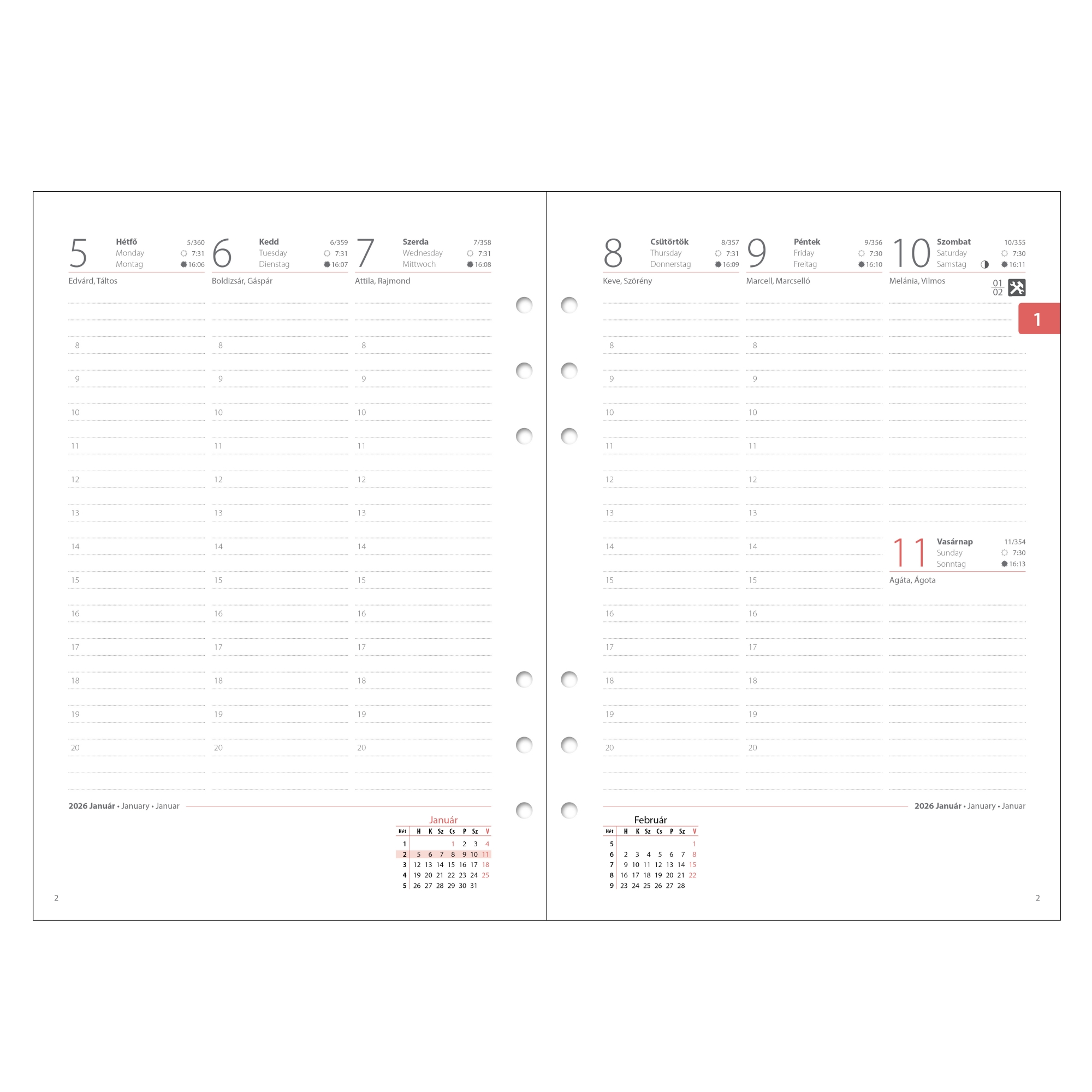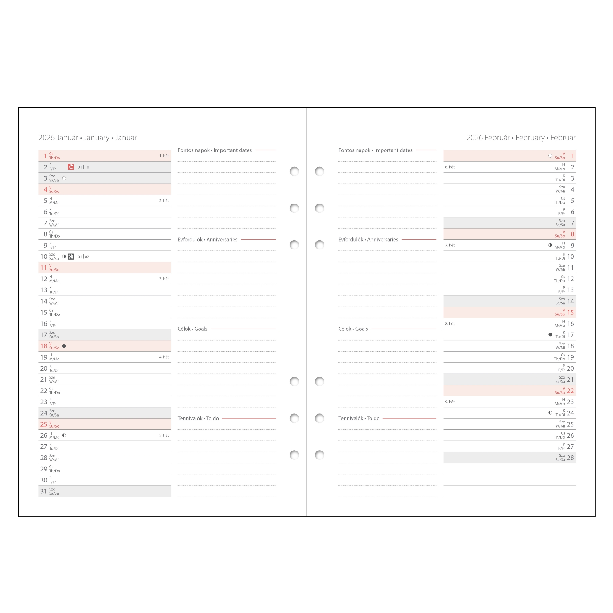 Gyűrűs kalendárium naptárbetét, fehér lapokkal, 1 hét / 2 oldalon, oszlopos elrendezésben. 2026. és 2027. évi összesített naptárral, havi tervezó, valamint jegyzet oldalakkal, éves tervezőkkel, információkkal. A5 (L, 1) méretű gyűrűs kalendáriumokban és A5 Clipbook termékekben használható.