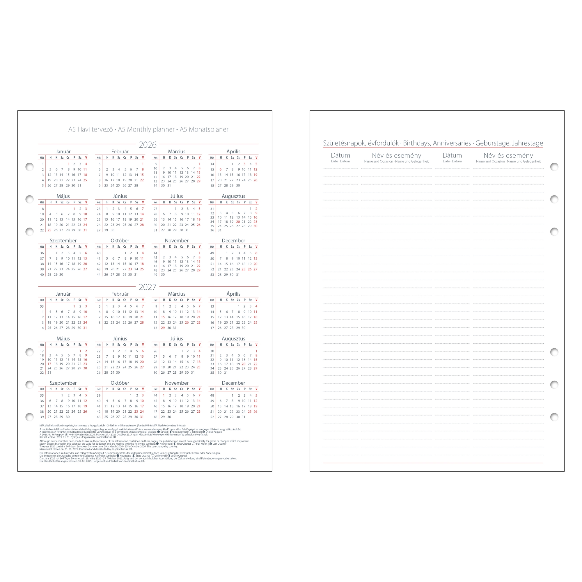 Gyűrűs kalendárium naptárbetét, 1 hónap 2 oldalon beosztással. 2026. és 2027. évi összesített naptárral, születésnap és évforduló tervezó, valamint éves tervek és célok rögzítésére használható oldallal. A5 (L, 1) méretű gyűrűs kalendáriumokban és A5 Clipbook termékekben használható.