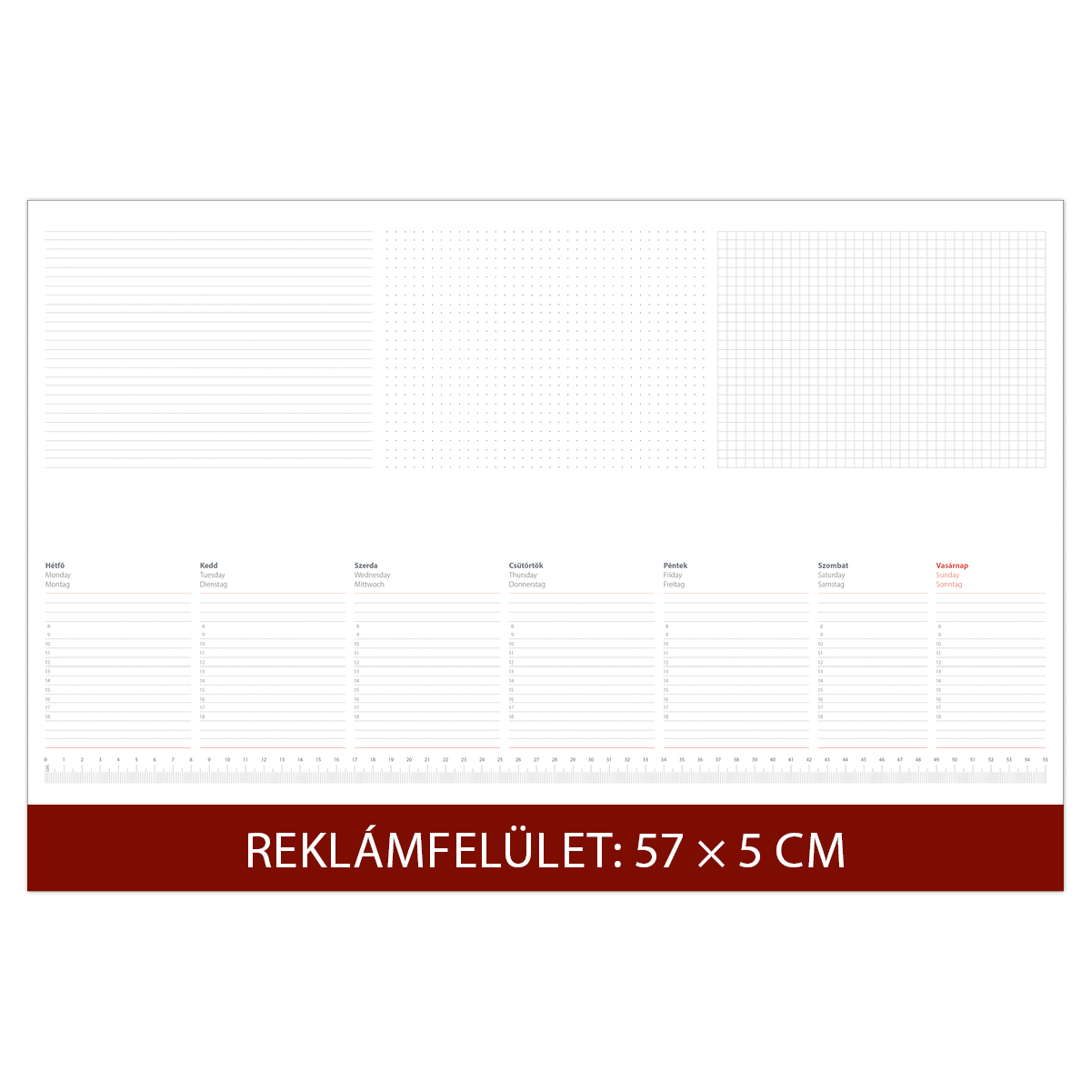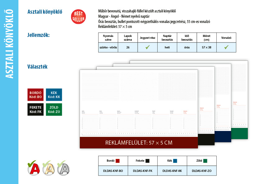 Dayliner asztali könyöklő műbőr visszahajtható füllel. A könyöklő védi az asztalt az esetleges káros behatásoktól és kiválóan alkalmas a hirtelen támadt ötletek, fontos feljegyzések, telefonszámok, teendők azonnali rögzítésére és 1 teljes hét áttekintésére. A termék fehér lapokkal készül.