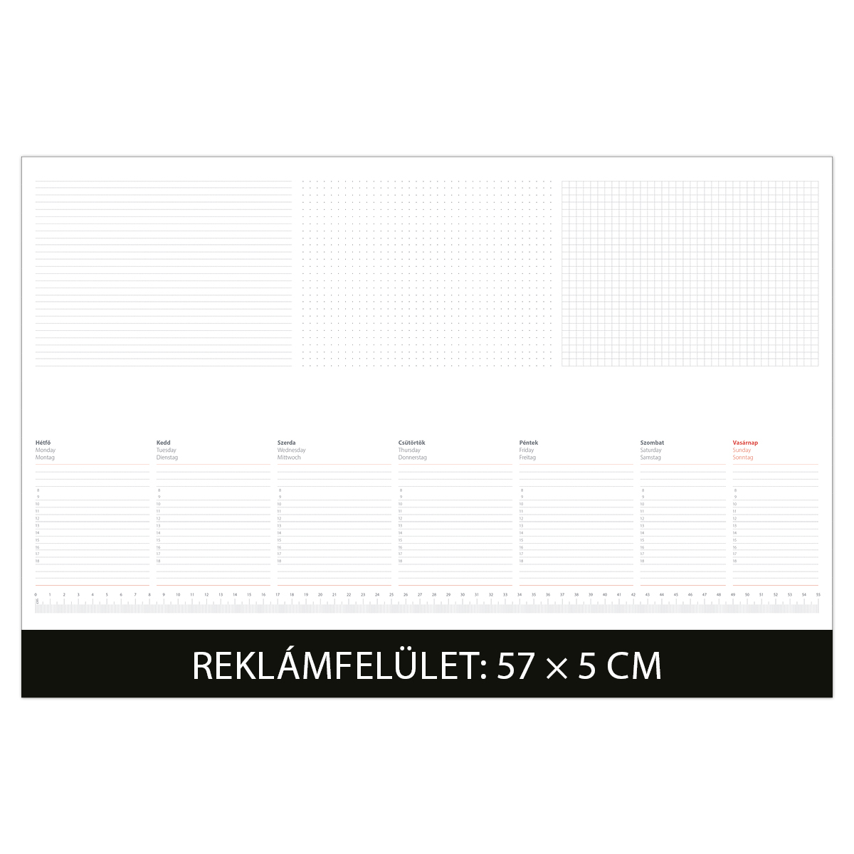 Dayliner asztali könyöklő műbőr visszahajtható füllel. A könyöklő védi az asztalt az esetleges káros behatásoktól és kiválóan alkalmas a hirtelen támadt ötletek, fontos feljegyzések, telefonszámok, teendők azonnali rögzítésére és 1 teljes hét áttekintésére. A termék fehér lapokkal készül.