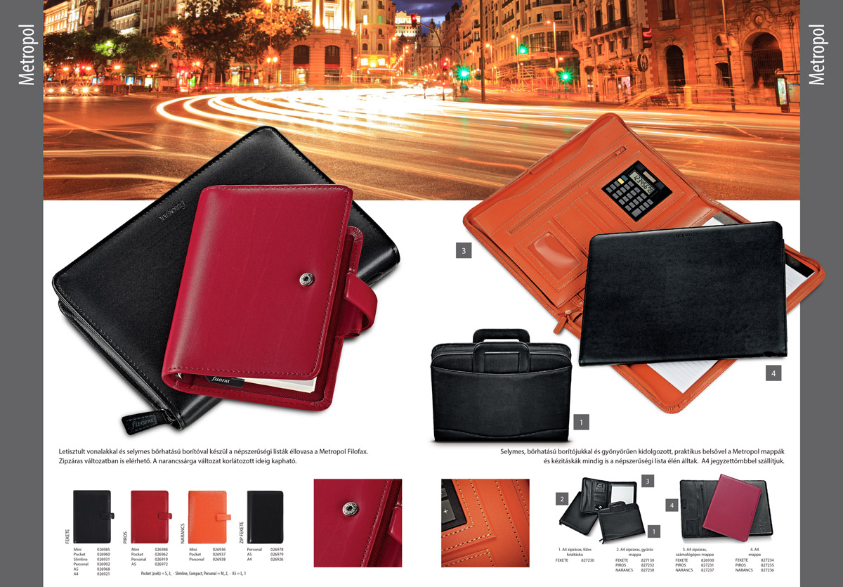A Metropol Filofaxok prémium minőségű, selymes felületű, valóban bőrhatást nyújtó műbőr borítóval készülnek nagy méretválasztékban. A Metropol Pocket Filofaxot a letisztult vonalak és a praktikus, mindent igényt kielégítő belső teszik igazán népszerűvé.