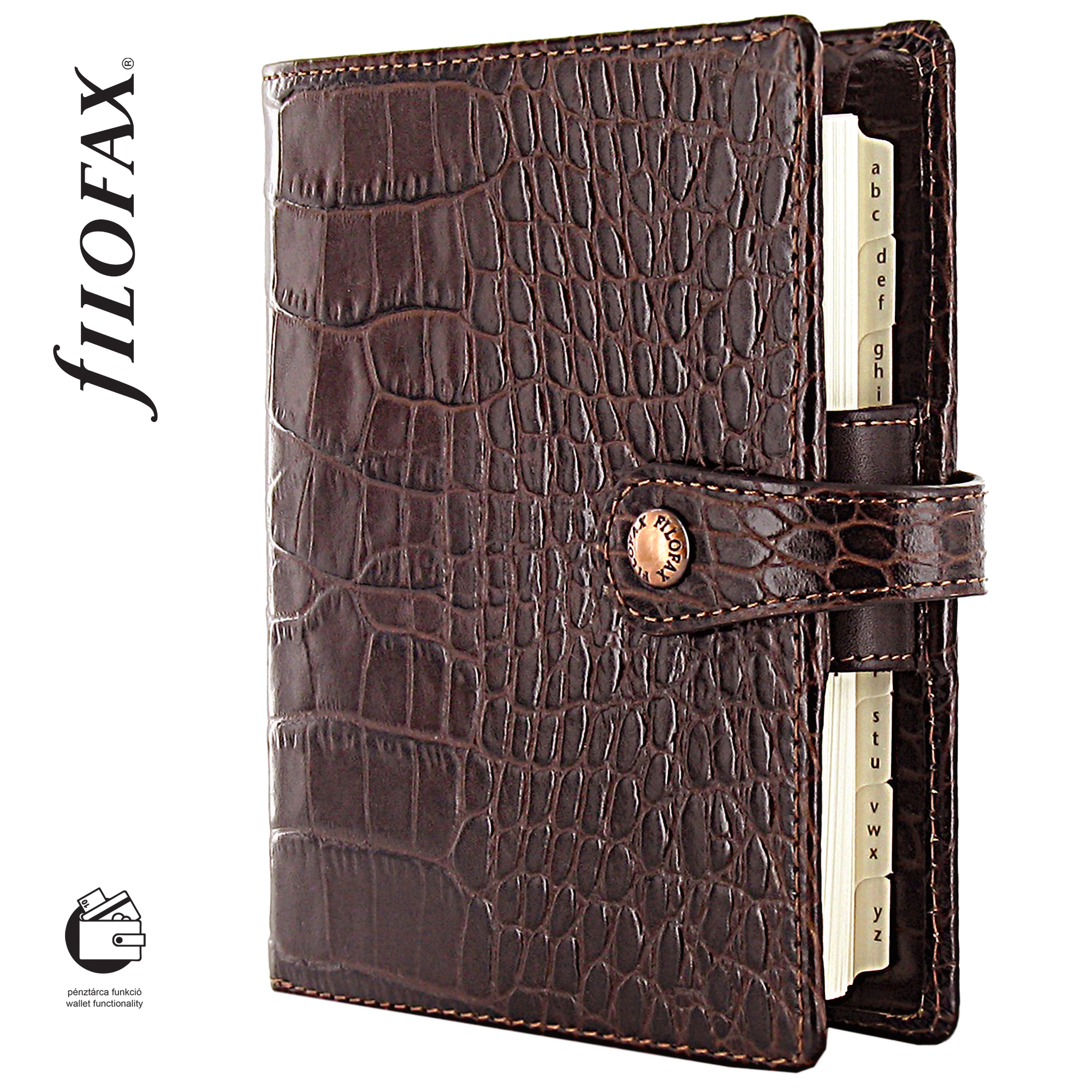 Tűnjön ki a tömegből az Osterley Filofax gyűrűs kalendáriummal! Luxus minőségű, krokodilbőr-mintázatú olasz borjúbőr borító, kézi kidolgozású, két-tónusú felülettel. Speciális kialakítású belső, mely mind üzleti, mind szabadidős célokra kiváló. A Pocket méret pénztárca funkcióval rendelkezik.