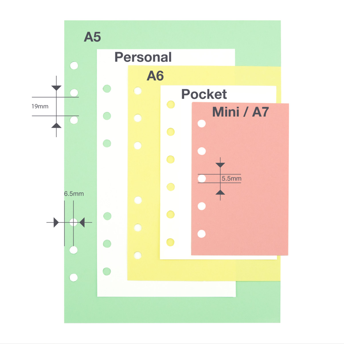 Filofax lapok lyukasztására használható lyukasztó. Mini, Pocket, Personal, Compact, Slimline, Filofax Mini, A5 méretekhez is alkalmas. Az A5 méretet is egy nyomással lyukasztja.